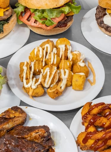 Potato bun burger vegetale stampato in 3d,cipolla caramellata, pomodoro di Sorrento,salsa barbecue,cheddar,insalata iceberg,salsa burger